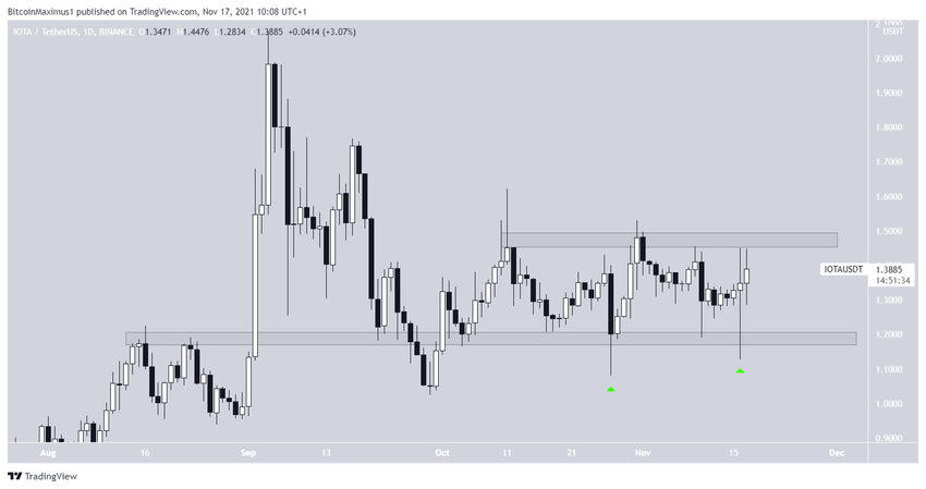 IOTA handluje w przedziale pomiędzy 1,18 a 1,50 USD od 4 października. Ostatnio odbiła się dwukrotnie od wsparcia tego zakresu (zielone ikony) w dniach 27 października i 16 listopada. To stworzyło długie dolne knoty, które są zwykle uważane za oznaki presji zakupowej.