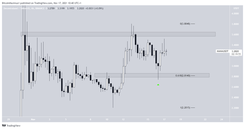 W dniu 16 listopada Decentraland (MANA) odbił się od horyzontalnego wsparcia na poziomie 2,81 USD (zielona ikona). Jest to również poziom wsparcia przy zniesieniu 0,618 Fib.