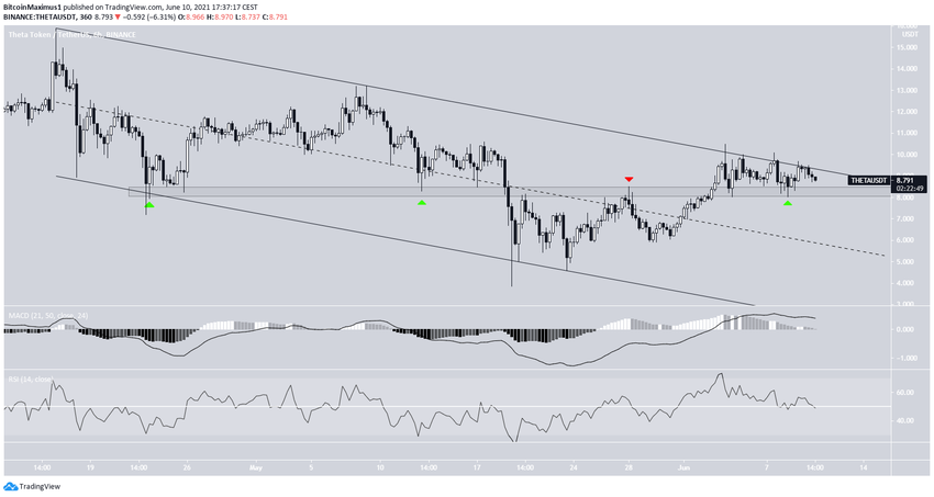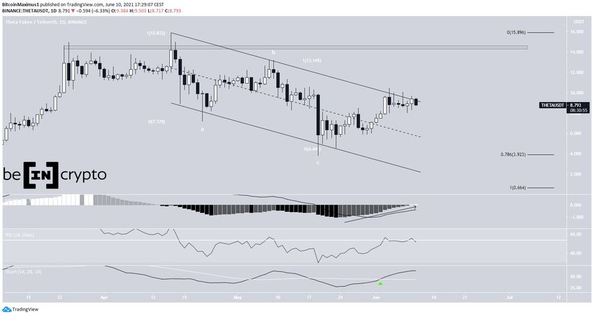 THETA spada wewnątrz opadającego kanału równoległego od dnia 16 kwietnia. W tamtym dniu cena osiągnęła rekord wszech czasów na poziomie 15,88 USD.