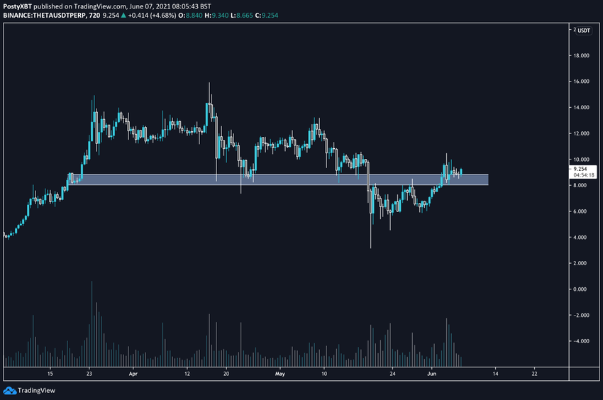 Trader kryptowalutowy @PostyXBT nakreślił wykres THETA, stwierdzając, że odwrócenie obszaru wsparcia na 8 USD jest silnym ruchem wzrostowym.