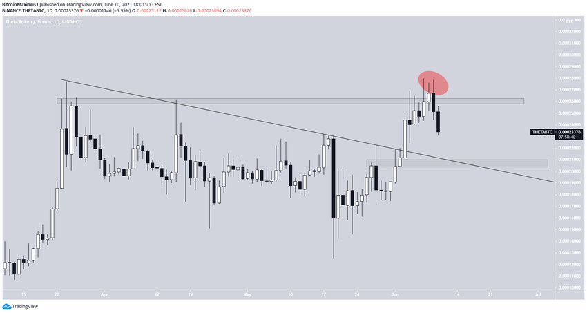 THETA/BTC próbuje znaleźć wsparcie na opadającej linii oporu, z której się wybił, a także na obszarze wsparcia przy 20 700 satoshi.