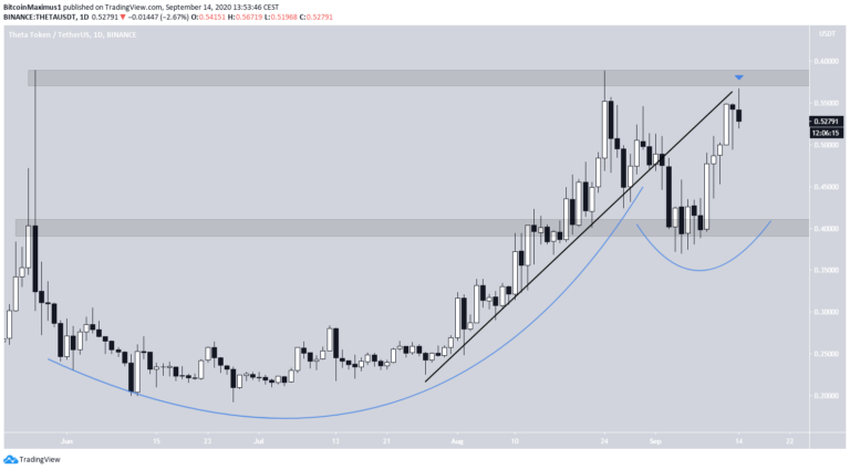 - Bycze nastawienie sugeruje, że cena jest obecnie na poziomie przełamania wzoru filiżanki i uchwytu, co może wynieść THETA na nowe ATH. W tym przypadku uchwyt z tego wzoru mieści się wewnątrz obszaru wsparcia na 0,40 USD.