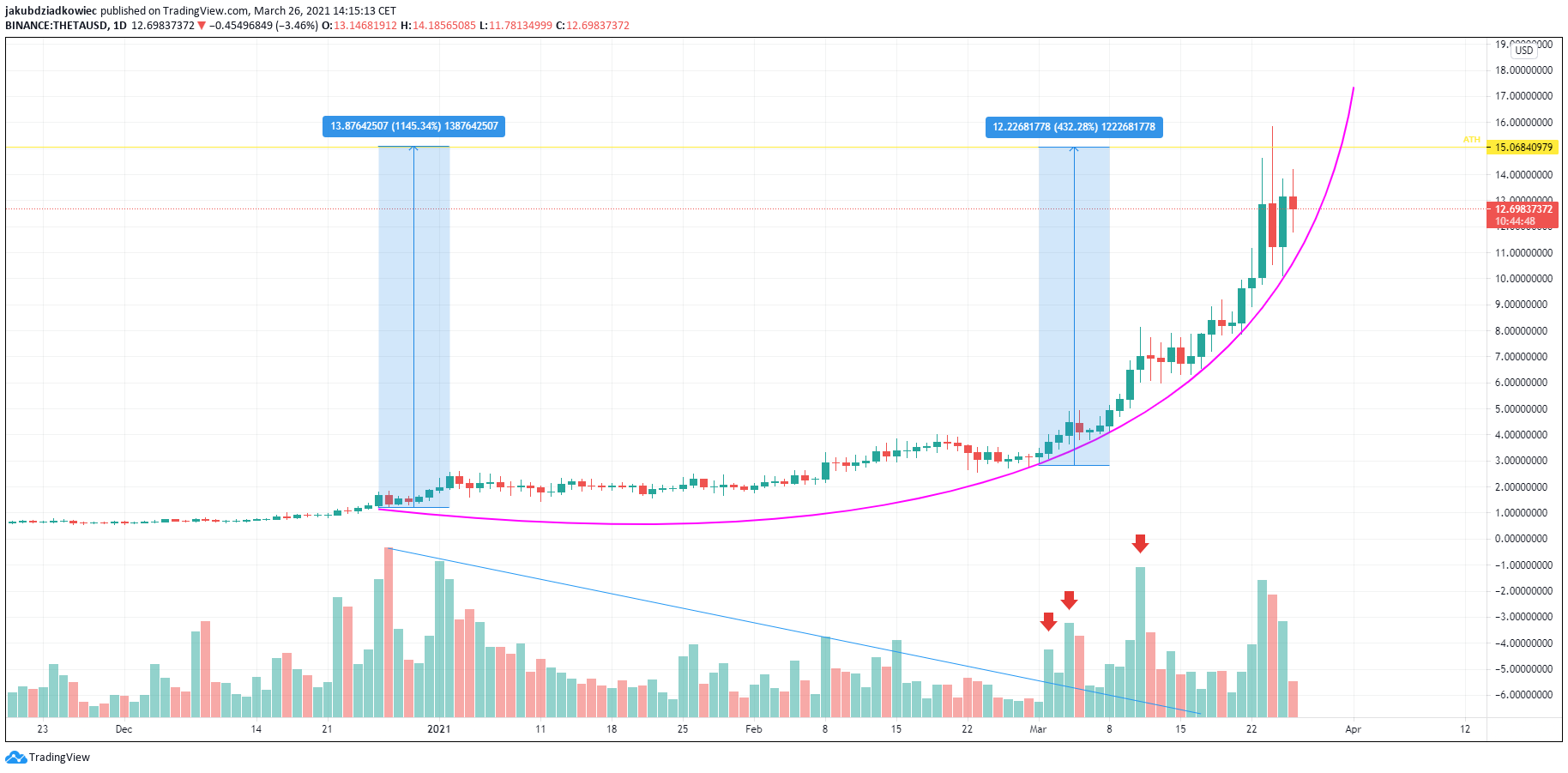 SponsoredOd tamtego czasu token kontynuował wzrosty w kierunku nowego ATH na 15 USD, który został osiągnięty w dniu 24 marca. Ruch przyjął kształt paraboliczny (fioletowa linia) i w długim terminie jest nie do utrzymania. Tylko od początku marca cena THETA wzrosła o 423%. Wówczas też można zaobserwować kolejne wybicie w wolumenie (czerwone strzałki).