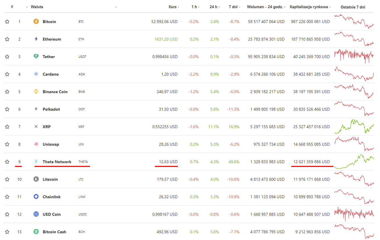 Bardzo pozytywna akcja cenowa THETA doprowadziła w ostatnich dniach tę kryptowalutę do pierwszej dziesiątki kryptowalut pod względem kapitalizacji rynkowej. Aktualnie wynosi ona ponad 12,5 mld USD, co daje THETA 9. pozycję pomiędzy Uniswap (UNI) a Litecoin (LTC).