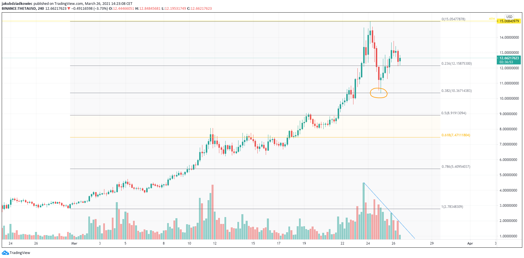 Aktualnie THETA jest notowana w obszarze 12,5 USD. Wykres 4-godzinny pokazuje trwającą od 24 marca korektę, której głębokość sięgnęła dotychczas 30%. Cena osiągnęła obszar 10 USD, który jest też poziomem zniesienia 0,382 Fib trwającego od marca ruchu wzrostowego (pomarańczowy okrąg).