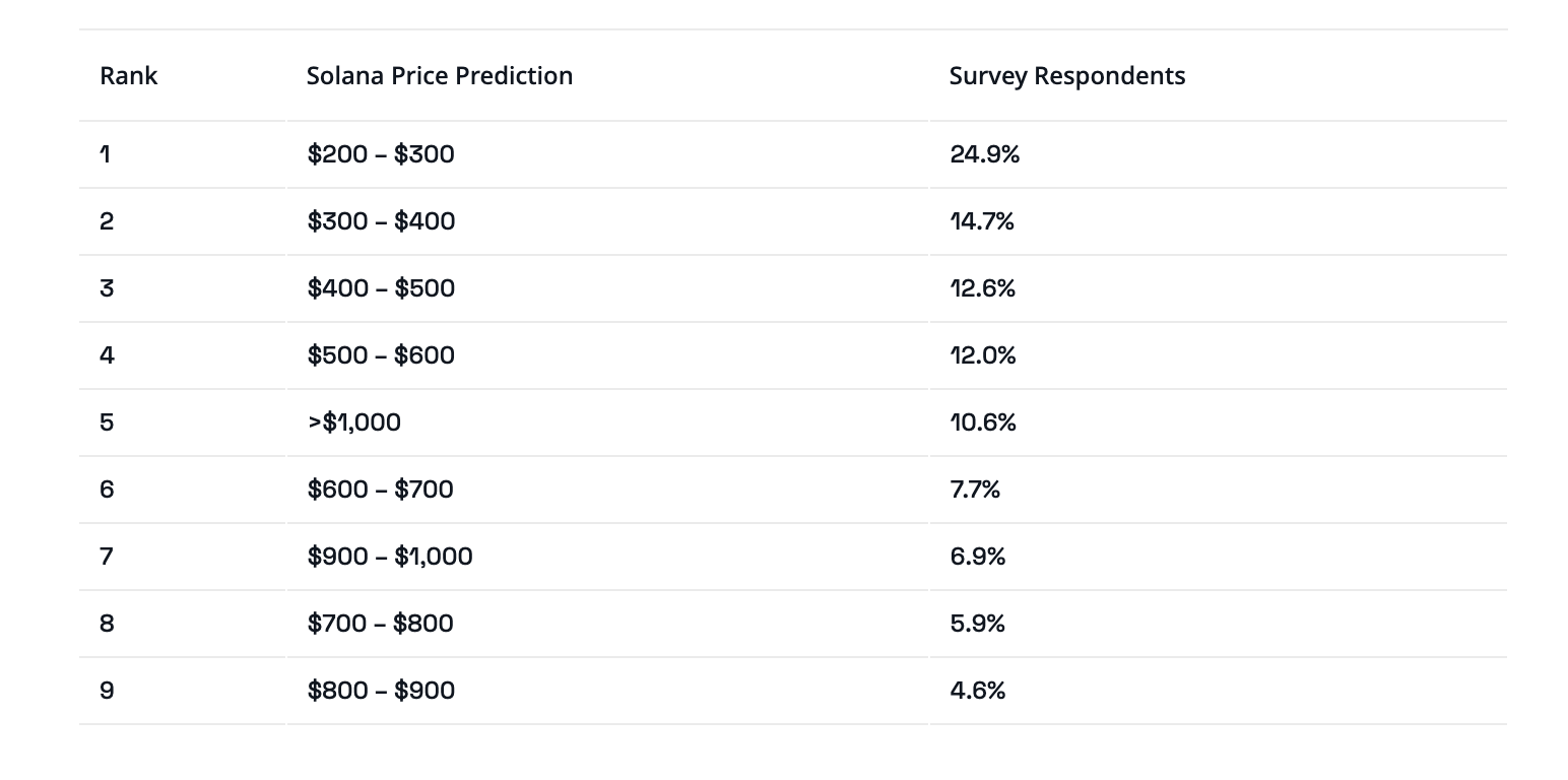 Jeśli chodzi o Solana, oczekiwania również nie są zbyt optymistyczne. Większość spodziewa się maksymalnej ceny między 200 a 300 USD.