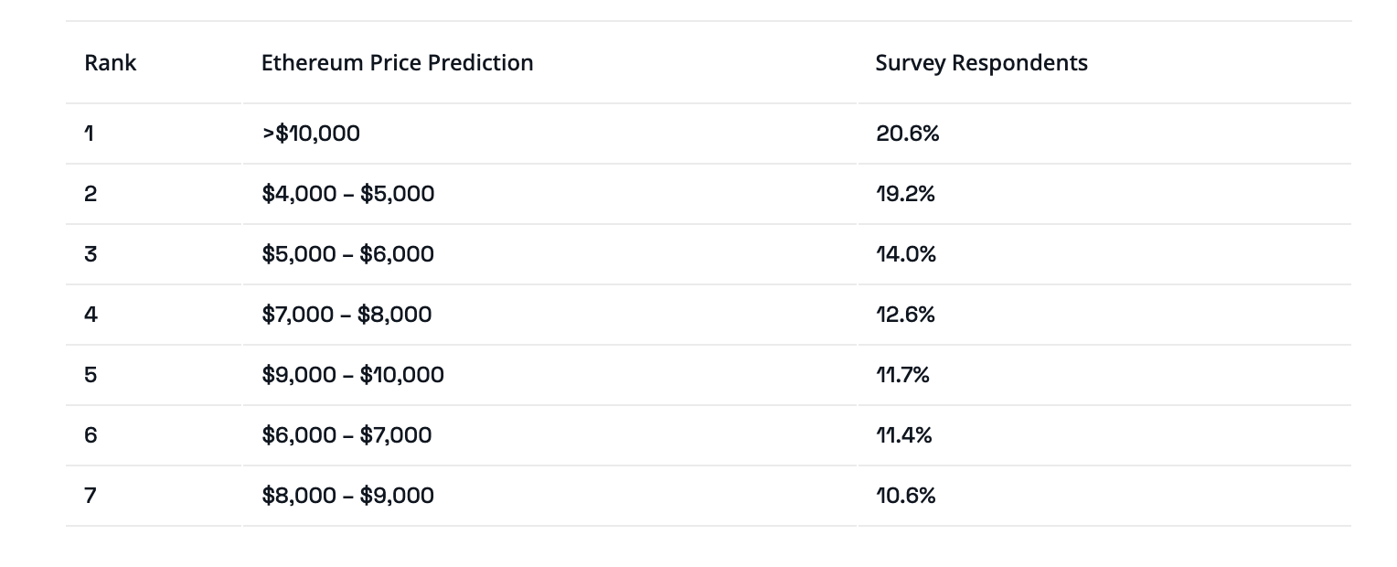 Jeśli chodzi o Ethereum, widzimy dość zróżnicowany obraz. 20,6% uważa, że cena wzrośnie powyżej 10 000 USD w tym cyklu. To sprawiłoby, że Ethereum trzykrotnie przekroczyłoby szczyt. 19,2% uważa, że maksymalna cena wyniesie 5000 USD .
