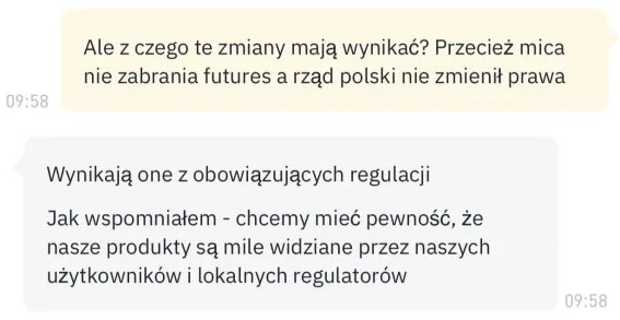 Za opisanie całej sytuacji zabrał się influencer Crypto Stasiak. Dla doprecyzowania szczegółów zdecydował się napisać bezpośrednio do supportu giełdy Binance. Pracownik platformy potwierdził sytuację opisaną w mailach, które giełda rozesłała do polskich użytkowników. Wszystko rozchodzi się o regulacje.