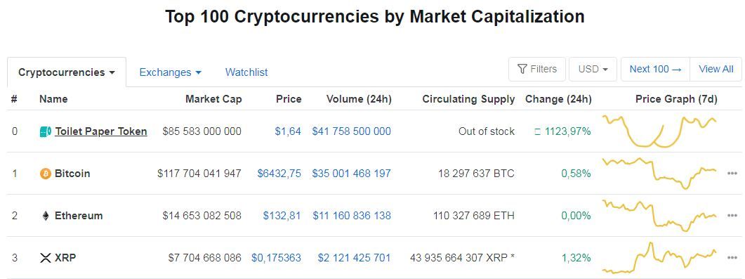 Toilet Paper Token pojawiło się na stronie przed kilkunastoma minutami. Nowy token znalazł się na liście 100 największych kryptowalut pod numerem #0.