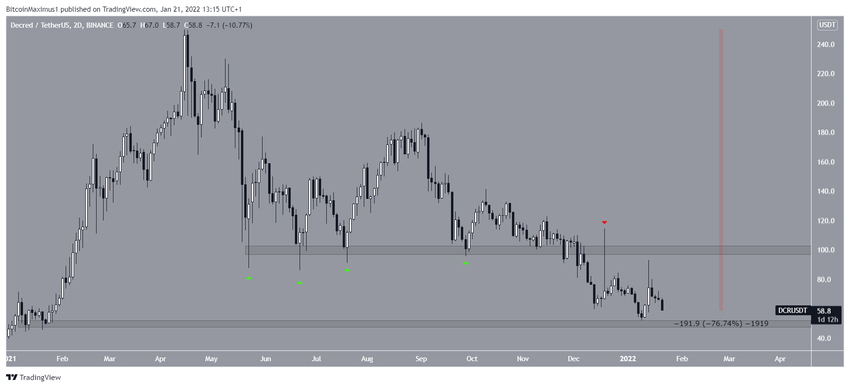DCR spada od 14 kwietnia, gdy osiągnął rekordowo wysoką cenę 250 USD. Mimo że czterokrotnie odbił się od poziomego obszaru wsparcia 100 USD, token załamał się 5 grudnia i 10 dni później zatwierdził obszar jako wsparcie (czerwona ikona) .
