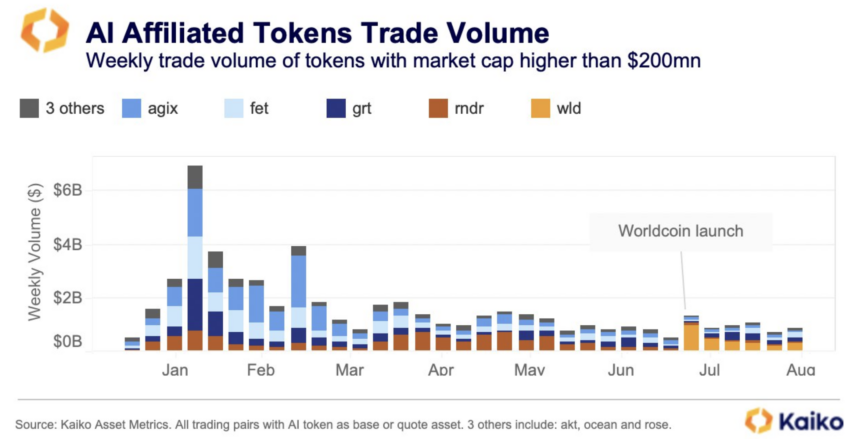 Jednak pod koniec lipca analitycy Kaiko odnotowali najniższy wolumen obrotu tokenami AI od początku roku. Tym samym dane dotyczące sześciu tokenów AI o największej kapitalizacji rynkowej – The Graph (GRT), Render (RNDR), Injective (INJ), Oasis Network (ROSE), SingularityNET (AGIX) oraz Fetch.ai (FET) wykazały, że wolumen obrotu tymi monetami spadł do najniższego poziomu od stycznia.