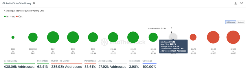 Ponadto potwierdza to fakt, że prawie 38,55 miliona tokenów LINK zbliża się do punktu, w którym stają się opłacalne. Ta podaż o wartości 684 mln USD została zakupiona między 17,49 a 18,73 USD. W związku z tym inwestorzy zdecydowaliby się na razie nie sprzedawać swoich udziałów, dopóki nie zostaną osiągnięte kolejne zyski w wysokości 684 mln USD.