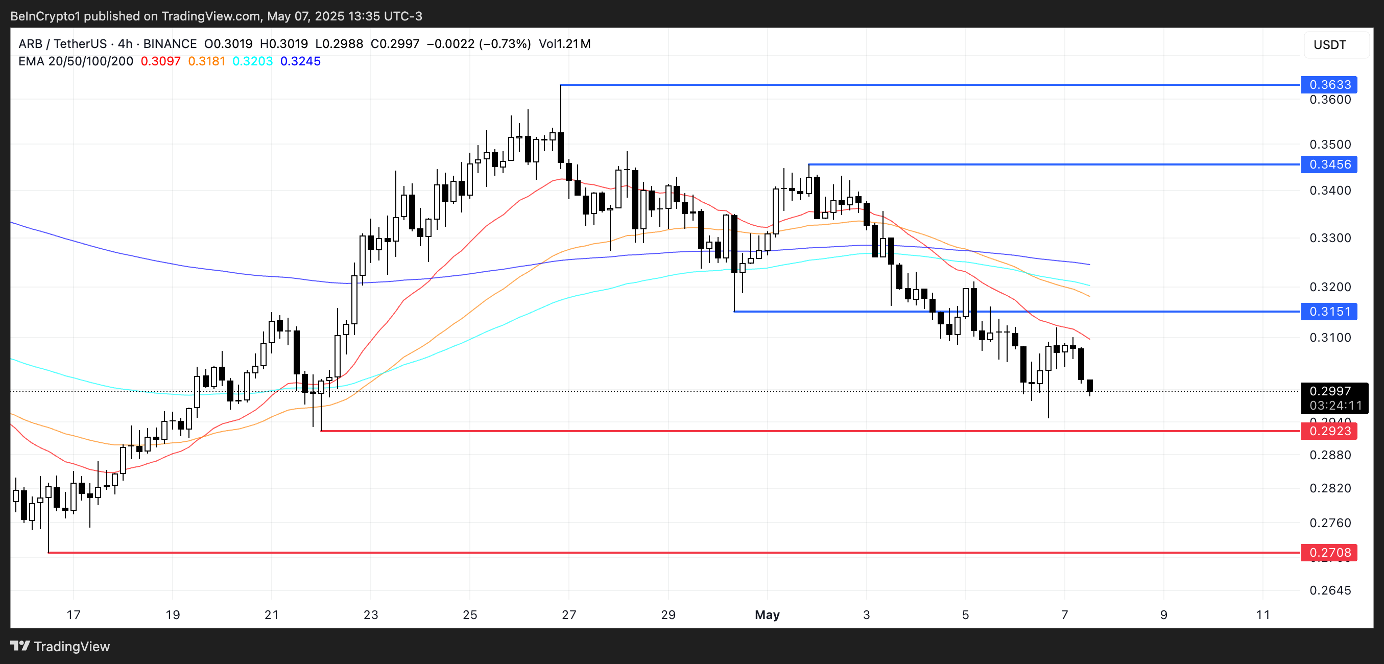 SponsoredMimo tych długoterminowych korzyści, ARB spadł o ponad 6% w ciągu ostatnich siedmiu dni. Jeśli korekta będzie kontynuowana, cena może spaść do poziomów na 0,292 USD. Jest to kluczowe wsparcie, a jeżeli ono nie przetrzyma, altcoin może potencjalnie spaść dalej do wartości na 0,27 USD.