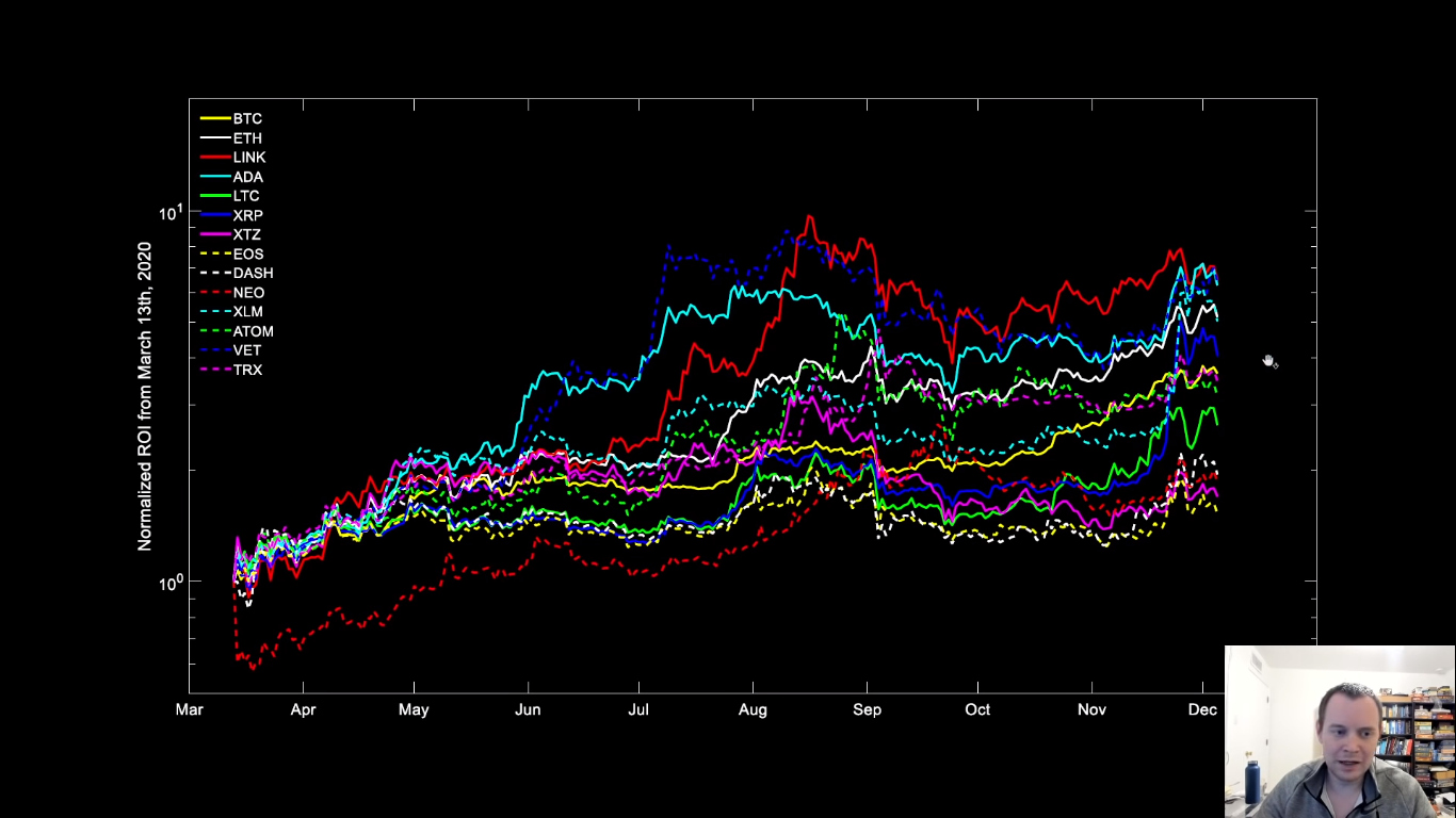 Wykres, do którego odwołuje się wielu analityków, pokazuje zbiera historyczne dane wybranych kryptowalut i porównuje zwrot z inwestycji (ROI, return of investment), na jaki w zeszłym roku mogli liczyć ich inwestorzy. Jednym z komentatorów, który często odwołuje się do tego wykresu, jest Benjamin Cowen. W swoim materiale wskazuje on na kryptowaluty z największym ROI w okresie od marca do grudnia 2020. Jego ranking kryptowalut otwiera LINK, VET i ADA, a za nimi XLM oraz ETH.