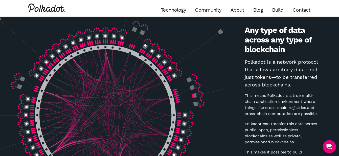 Polkadot (DOT) jest protokołem open source służącym do dzielenia się na fragmenty (sharding), aby umożliwić przesyłanie danych i tokenów pomiędzy różnymi łańcuchami bloków. Charakteryzuje się cechą interoperacyjności (interoperability), której celem jest utworzenie w pełni zdecentralizowanej i prywatnej sieci dla tworzenia aplikacji i usług.