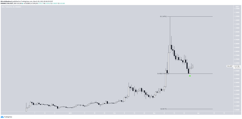Jeśli chodzi o ruch cenowy, to SKL spadał od czasu, gdy w dniu 13 marca osiągnął ATH na poziomie 1,244 USD. Jednak właśnie odbił się od poziomu wsparcia zniesienia 0,618 Fib o wartości 0,51 USD.