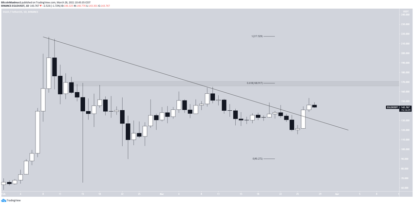 Jeśli chodzi o akcję cenową, to EGLD właśnie wybił się z opadającej linii oporu.