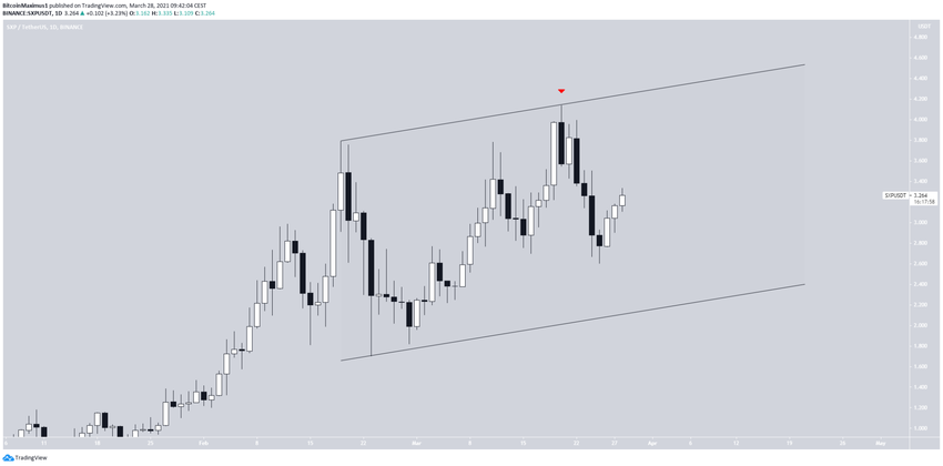 Jeśli chodzi o ruch cenowy, to SXP może znajdować się w równoległym kanale rosnącym, po tym jak zaczął spadać w dniu 20 marca.