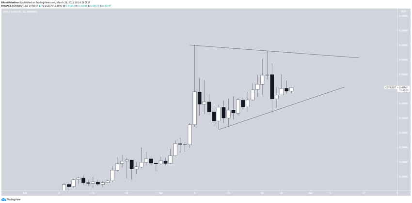 W odniesieniu do akcji cenowej COTI wydaje się znajdować wewnątrz bardzo dużego wzorca symetrycznego trójkąta.