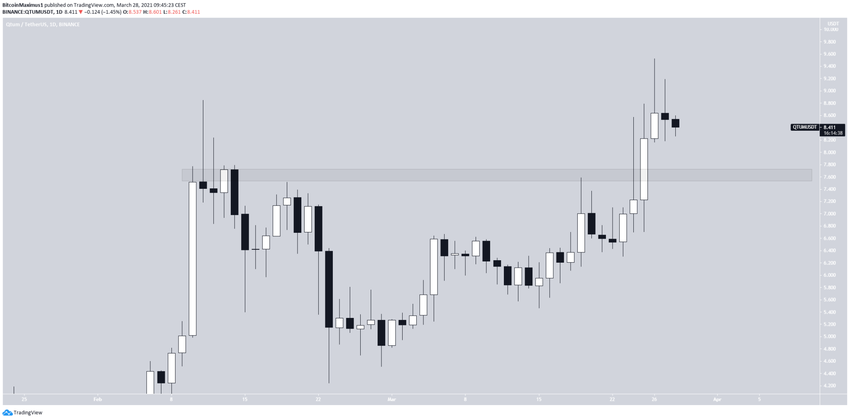 Jeśli chodzi o akcję cenową, to wzrost QTUM utknął w martwym punkcie od dnia 26 marca. Jednak nadal jest ono notowane powyżej poprzedniego oporu na poziomie 7,65 USD.