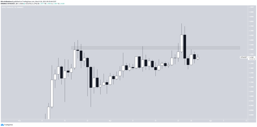 Jeśli chodzi o ruch cenowy, to IOTA spadła poniżej poziomu 1,52 USD po fałszywym wybiciu powyżej tego poziomu.