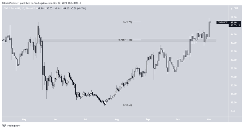 DOT prawie osiągnął nowe ATH w dniu 22 października i zaczął spadać. Jednak zatwierdził obszar 41,35 USD jako wsparcie i rozpoczął odbicie w dniu 27 października.