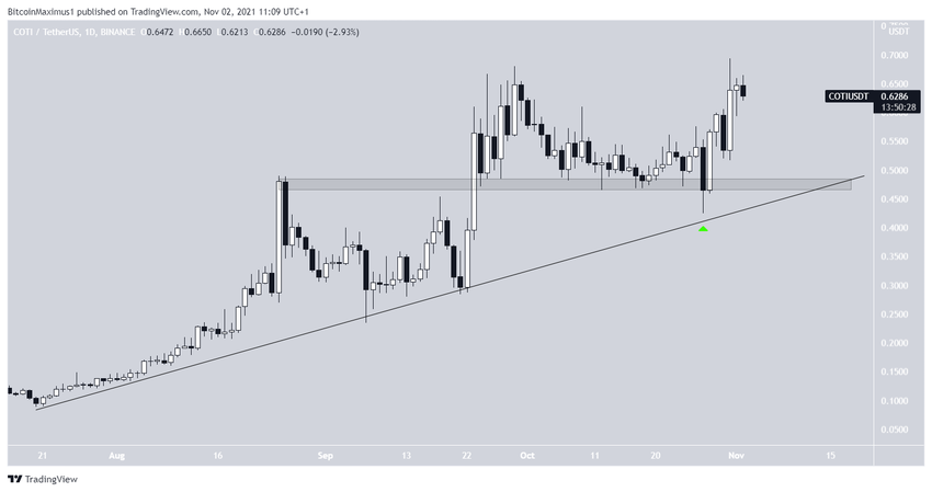 COTI spada od 29 września, kiedy to osiągnął ATH na poziomie 0,68 USD.