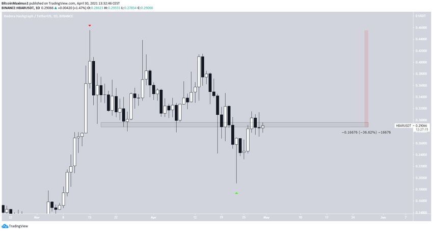 HBAR spada od dnia 15 marca, kiedy osiągnął szczyt na 0,445 USD. Jednak najwyraźniej odwrócił swój trend za pomocą świecy młotkowej z dnia 23 kwietnia. Obecnie próbuje odzyskać obszar oporu na 0,30 USD.