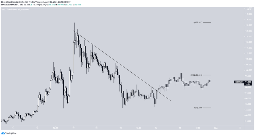 NEO poruszał się w górę od dnia 23 kwietnia i wkrótce potem wybił się z opadającej linii oporu. Jednak nie odzyskał jeszcze nawet poziomu oporu na 0,382 Fib.
