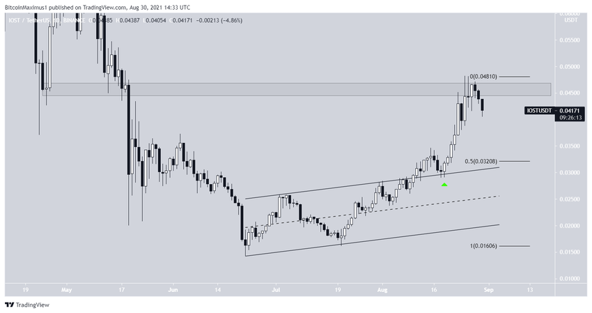 IOST wybił się z równoległego kanału wzrostowego w dniu 11 sierpnia i powrócił, aby zatwierdzić go jako wsparcie w dniu 20 sierpnia (zielona ikona).