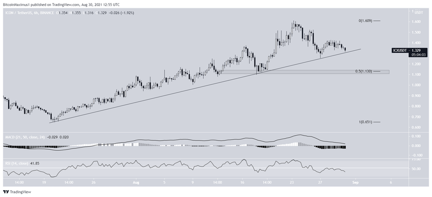 ICX wzrastał wzdłuż wznoszącej się linii wsparcia od 20 lipca i osiągnął szczyt 1,61 USD w dniu 23 sierpnia.