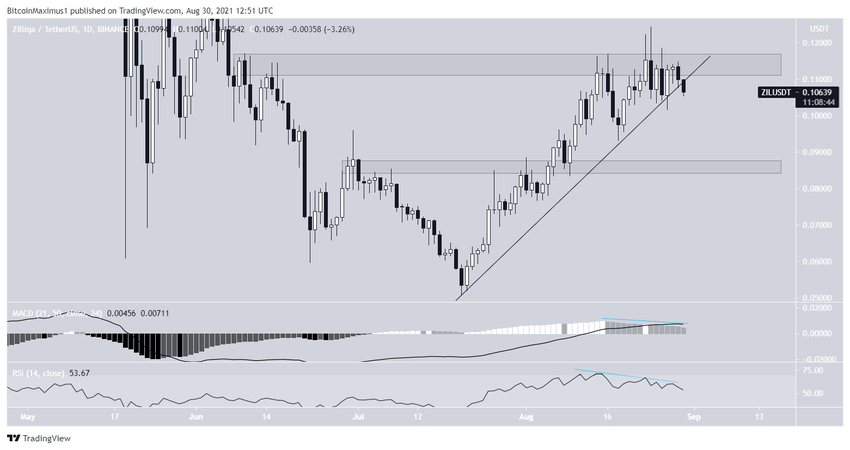 ZIL jest konsekwentnie odrzucana przez obszar oporu przy 0,115 USD od dnia 14 sierpnia. Odrzucenie zostało połączone z niedźwiedzią dywergencją na RSI i MACD. Dodatkowo ZIL wydaje się załamywać z rosnącej linii wsparcia.