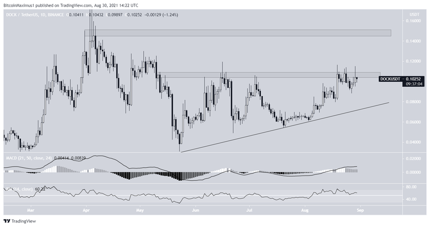 DOCK próbuje wybić się z horyzontalnego obszaru oporu przy 0,107 USD. Co więcej, potencjalnie podąża za wznoszącą się linią wsparcia, co z kolei stworzyłoby trójkąt zwyżkujący.