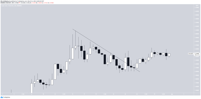 ENJ od 15 marca, kiedy to osiągnął szczyt na poziomie 3,08 USD, porusza się w dół. Niemniej jednak, wybił się z opadającej linii oporu.