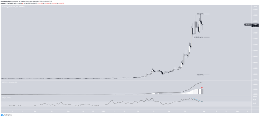 Jeśli chodzi o ruch cenowy, ONE osiągnął rekordową cenę 0,224$ w dniu 29 marca. Podczas gdy obecnie jest notowany w pobliżu tego poziomu, zaczął wykazywać słabość w postaci niedźwiedziej dywergencji.