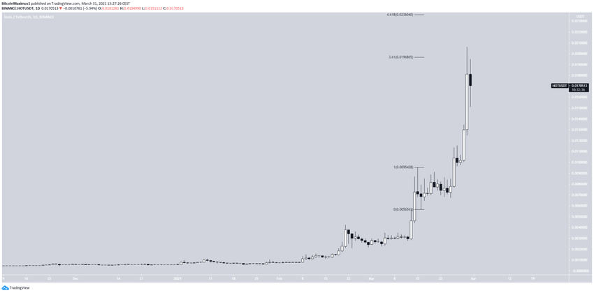 30 marca HOT osiągnął szczyt na poziomie 0,020 USD, ale od tego czasu nieznacznie spadł. Wzrost został osiągnięty dokładnie na poziomie 3,61 zewnętrznego zniesienia Fib ostatniego spadku. Następny opór znajduje się na poziomie 0,023 USD.
