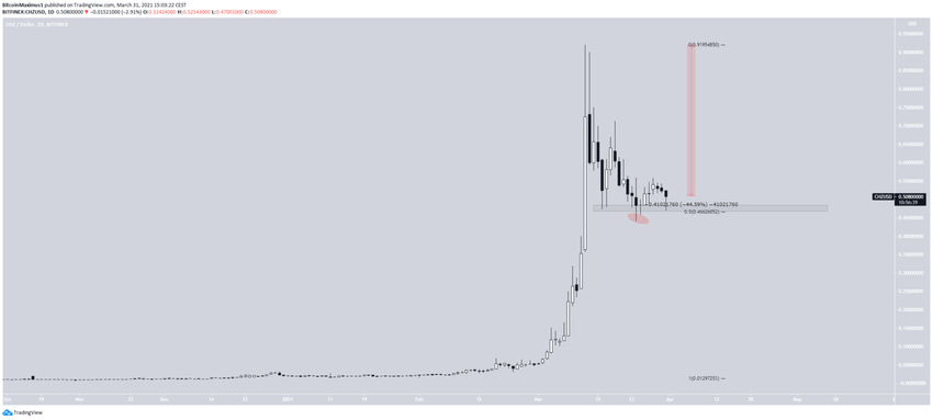 Niemniej jednak, odbiła się od poziomu 0,5 Fib na poziomie 0,46$ po spadku poniżej i od tego czasu porusza się w górę.