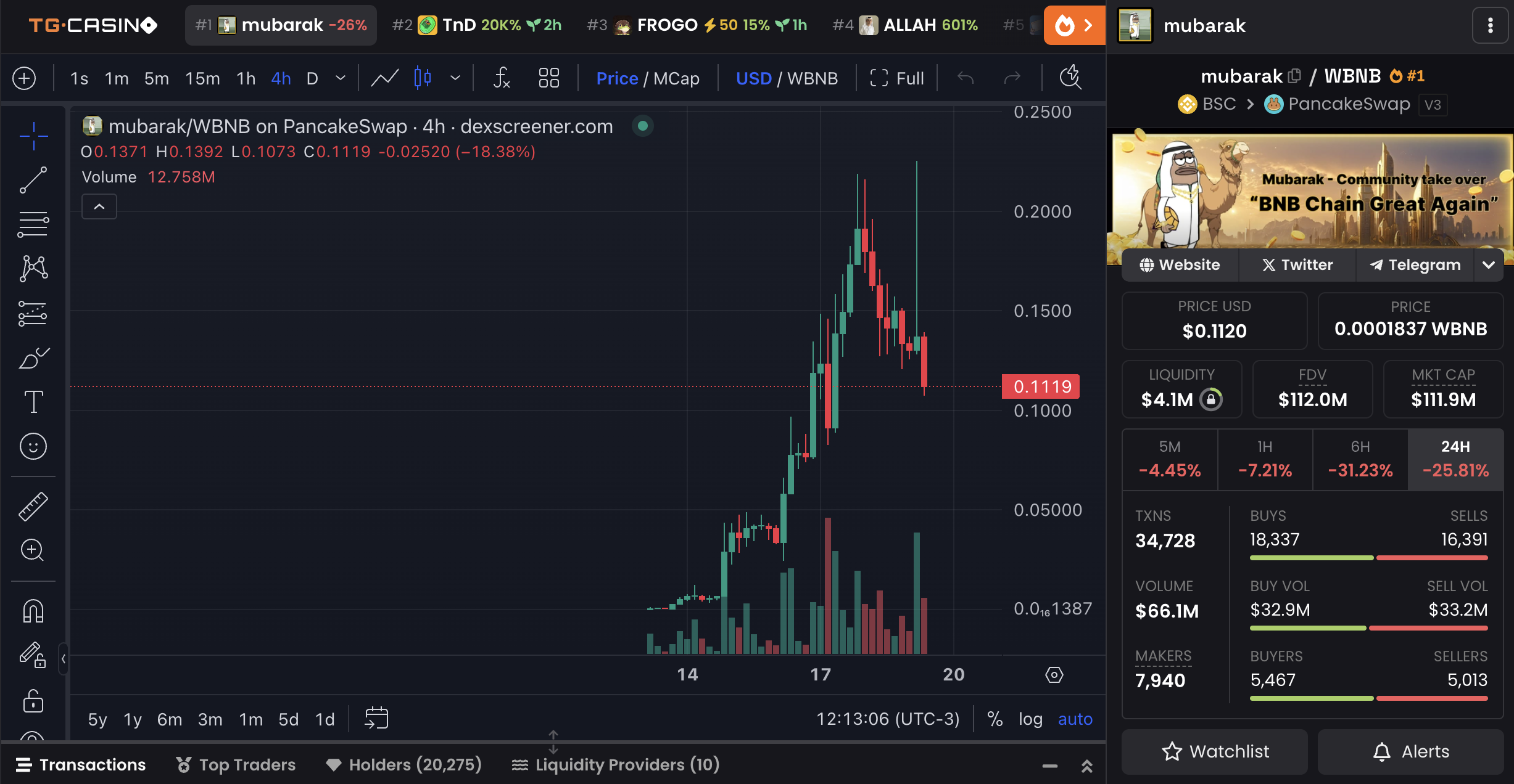 Mubarak szybko stał się jednym z najczęściej omawianych memecoinów w ekosystemie BNB w ciągu ostatnich kilku dni. Wczoraj jego kapitalizacja rynkowa na krótko zbliżyła się do poziomu 200 mln USD, zanim spadła do około 112 mln USD dzisiaj.