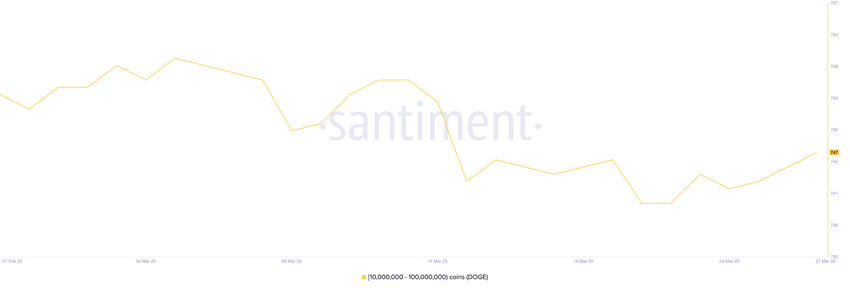 Konkretnie, liczba portfeli posiadających od 10 mln do 100 mln DOGE wzrosła z 740 do 747—najwyższy poziom od dwóch tygodni.