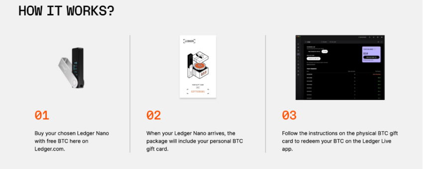 Portfele sprzętowe sprawiają, że samodzielna opieka nad kryptowalutami (self-custody) jest prosta i bezpieczna. Pozwala użytkownikom doświadczyć całkowitej niezależności finansowej. Ledger oferuje teraz zniżkę do 30 USD w BTC przy zakupie Ledger Nano X, podczas gdy nabywcy Nano S otrzymują 20 USD w BTC.