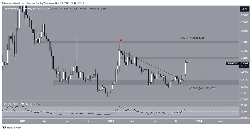 W listopadzie 2023 r. altcoin rozpoczął ruch w górę i wybił się z linii trendu. Wzrost przyspieszył w zeszłym tygodniu, prowadząc do szczytu na poziomie 0,19 USD, nieco poniżej obszaru oporu 0,20 USD.