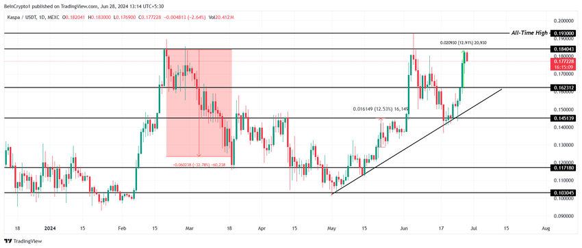 Cena Kaspa może osiągnąć nowy rekord wszech czasów w nadchodzącym miesiącu, ponieważ jest to jeden z altcoinów, które utrzymują trend wzrostowy. Ruch w górę, który rozpoczął się na początku maja, wciąż się utrzymuje. Natomiast KAS, notowany obecnie na poziomie 0,177 USD, może na tym skorzystać.