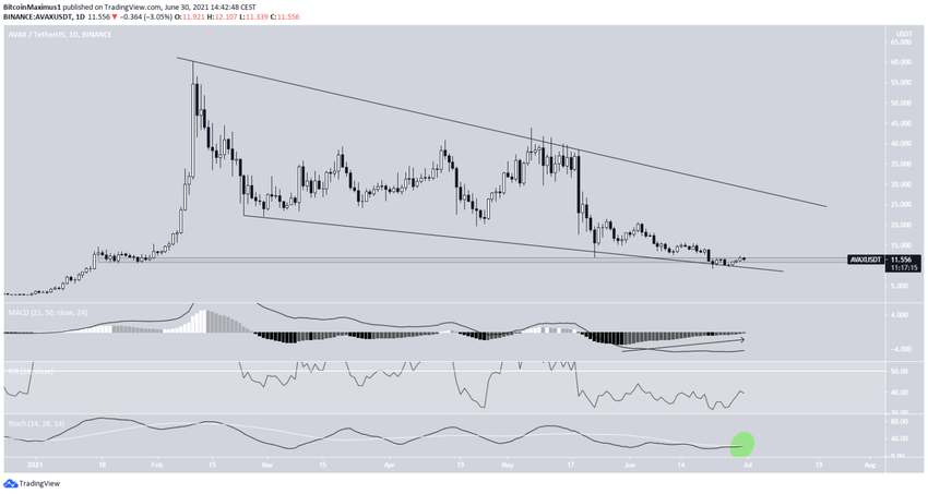 Avalanche to platforma, która służy do uruchamiania aplikacji DeFi . Oprócz tego ma zastosowanie w handlu i konfigurowaniu aplikacji finansowych. Jednym z głównych celów platformy jest stanie się globalną giełdą aktywów, co oznacza, że każdy może handlować i kontrolować swoje aktywa w sposób zdecentralizowany. Został uruchomiony we wrześniu 2020 r., a jego natywnym tokenem jest AVAX. Protokół Defi Yield, który jest platformą farmingową, zakończy swoją ekspansję do Avalanche w lipcu. Oprócz tego, stablecoin USDC przybędzie do Avalanche gdzieś w lipcu. AVAX porusza się w dół od 10 lutego, kiedy osiągnął ATH. Podąża za opadającą linią wsparcia i potencjalnie notowany jest wewnątrz zniżkowego klina. 22 czerwca osiągnął opadającą linię wsparcia, która zbiega się z poziomym obszarem wsparcia 11,30 USD. Jeśli token nie odbije się na tym poziomie, może gwałtownie spaść z powodu braku wsparcia poniżej obecnej ceny. Wskaźniki techniczne pokazują pewne bycze oznaki, takie jak bycza dywergencja na histogramie MACD i zbliżający się byczy krzyż w oscylatorze stochastycznym.