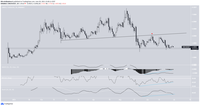 1inch to agregator DEX, który służy do znajdowania najlepszych cen kryptowalut na giełdach DEX. Eliminuje potrzebę ręcznego sprawdzania cen, a raczej pozyskiwanie płynności z giełd i oferowanie użytkownikom najlepszych stawek swapowych. Został uruchomiony w sierpniu 2020 roku, stworzony przez Sergeja Kuncza i Antona Bukova. Jego natywny token to 1INCH. Ustaloną metodą zarabiania tokenów jest zapewnienie płynności na platformie i otrzymanie tokenów w zamian. Unikalną cechą 1 inch jest natychmiastowe zarządzanie, umożliwiające użytkownikom głosowanie na określone ustawienia protokołu. Pod koniec czerwca szwajcarski bank Sygnum zaczął oferować klientom możliwości inwestowania w kilku tokenach DeFi, w tym 1inch. 1INCH odbił się powyżej obszaru 2,25 USD 23 maja, ale powrócił do tego obszaru ponownie w lipcu. Potencjalnie jest w trakcie tworzenia wzoru podwójnego dna . Formacja została również połączona ze znaczącą byczą rozbieżnością w oscylatorze RSI, MACD i stochastycznym. Pomimo możliwości odbicia, trendu nie można uznać za zwyżkowy, dopóki token nie odzyska linii wsparcia, od której zerwał (czerwona ikona).