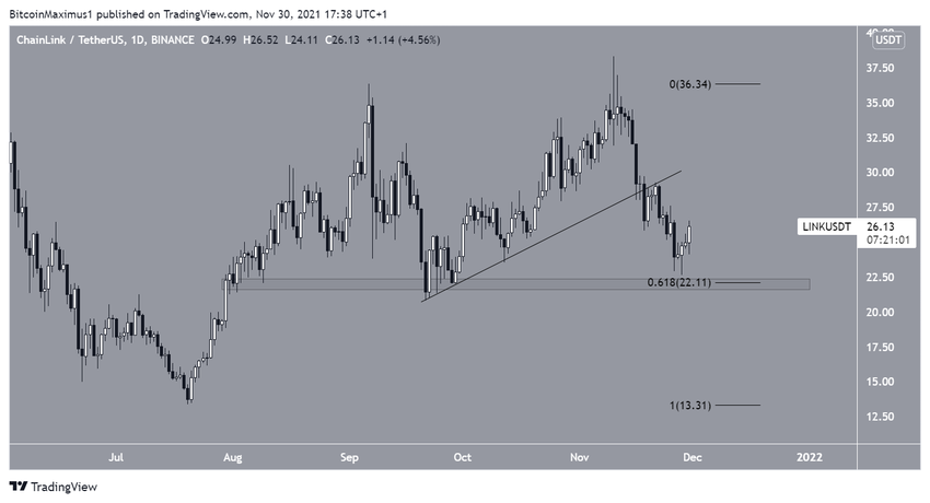 Podczas gdy załamał się z rosnącej linii wsparcia, odbił się powyżej obszaru wsparcia horyzontalnego na poziomie 22,10 USD. Jest to również poziom wsparcia przy zniesieniu 0,618 Fib. Dlatego też potencjalnie może zainicjować ruch wzrostowy.