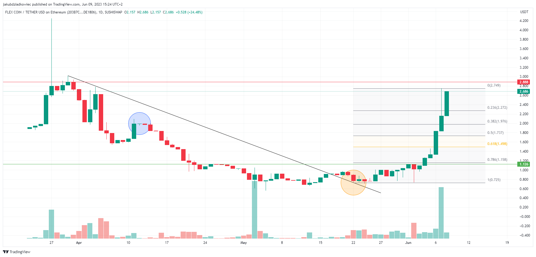 Do początku czerwca trend wzrostowy się nasila, a kurs FLEX codziennie generuje dwucyfrowe wzrosty. Najbliższym oporem jest teraz poziom 2,89 USD, na którym zamknęła się dzienna świeca w marcu 2023 roku.
