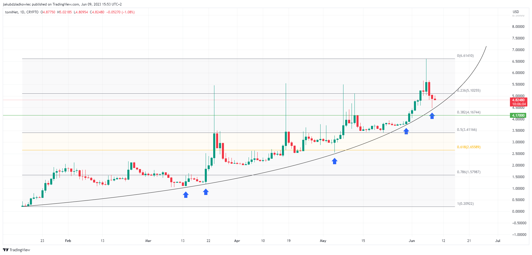 Kurs TOMI znajduje się w silnym trendzie wzrostowym od premiery w połowie stycznia 2023 roku. Wykres zdaje się podążać za parabolicznie rosnącą krzywą (czarna), która była już 5 razy zatwierdzana (niebieskie strzałki).