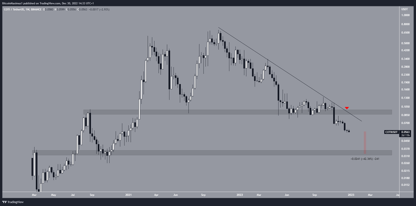 Cena COTI musi wybić się z obecnej opadającej linii oporu i obszaru oporu na 0,095 USD, aby trend był byczy.