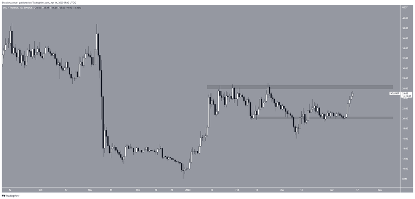 Następna w rankingu TOP 5 najlepsze altcoiny jest Solana. Cena SOL wzrasta od 10 marca. W dniu 9 kwietnia utworzyła wyższy dołek, po czym przyspieszyła tempo wzrostu. Cena zbliża się teraz do obszaru oporu przy 26 USD. Jeśli się wybije, to następny opór będzie na poziomie 36 USD.