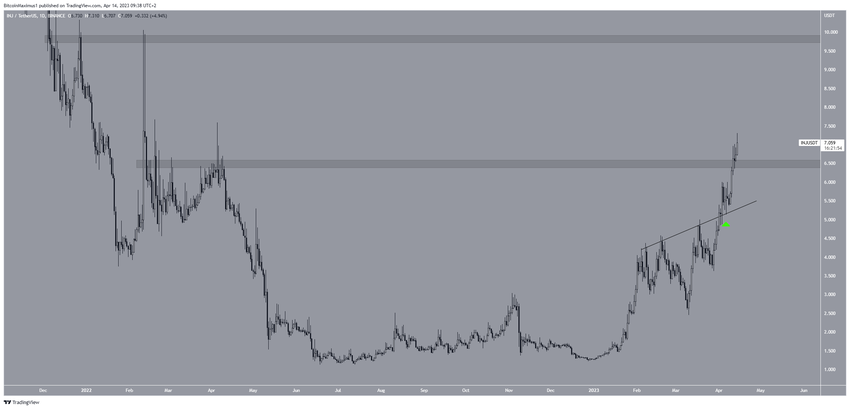Cena INJ wzrosła od czasu wybicia ze wznoszącej się linii oporu i zatwierdzenia jej jako wsparcia w dniu 6 kwietnia (zielona ikona). Później wzrost przyspieszył, a cena odzyskała rejon oporu przy 6,50 USD w dniu 12 kwietnia.